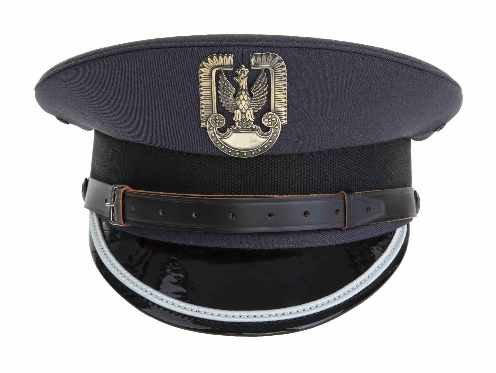 Czapka w kolorze stalowym z białym otokiem. Posiada czarny daszek nad którym znajduje się czarny pasek wykonany ze skóry oraz orzełek metalowy lub płócienny.